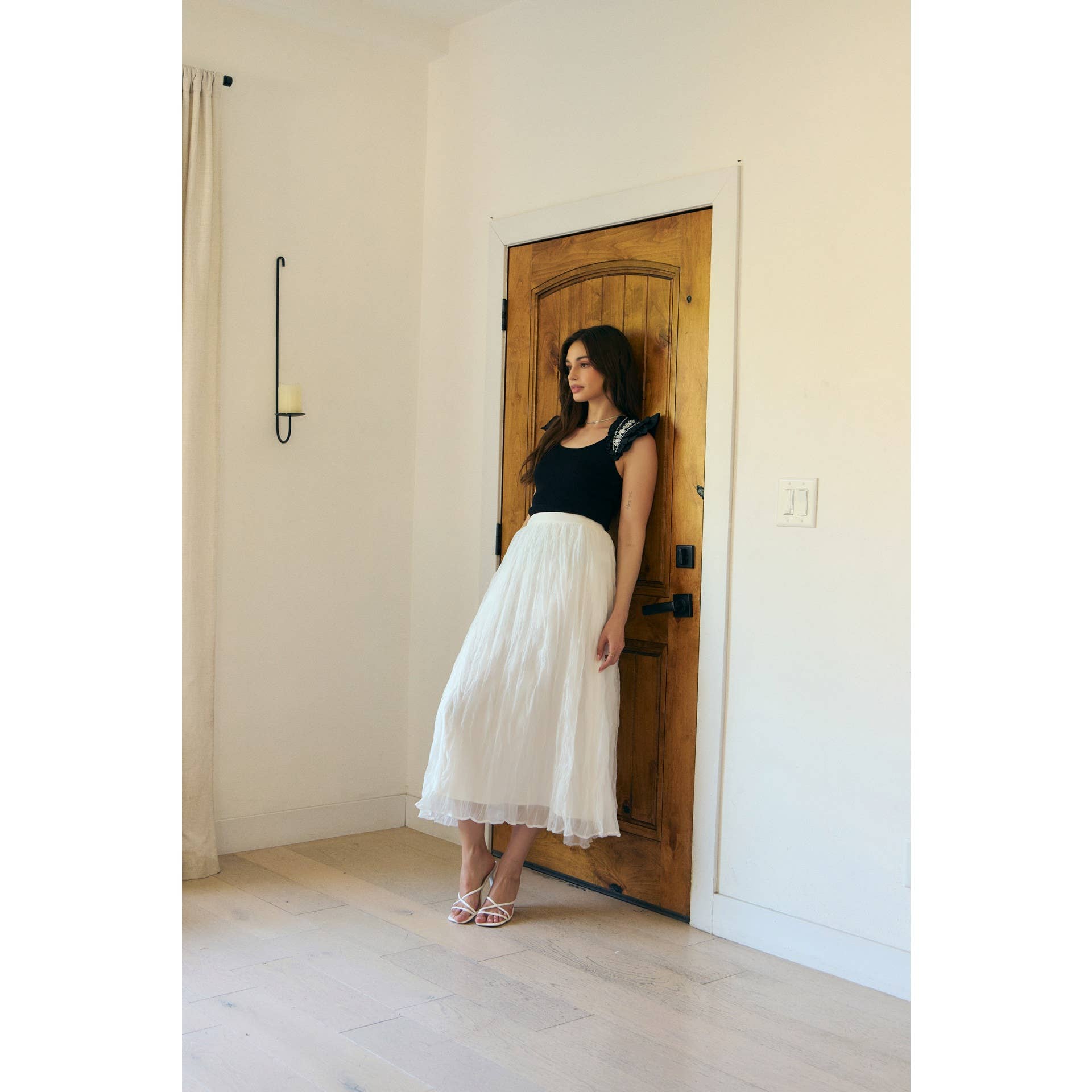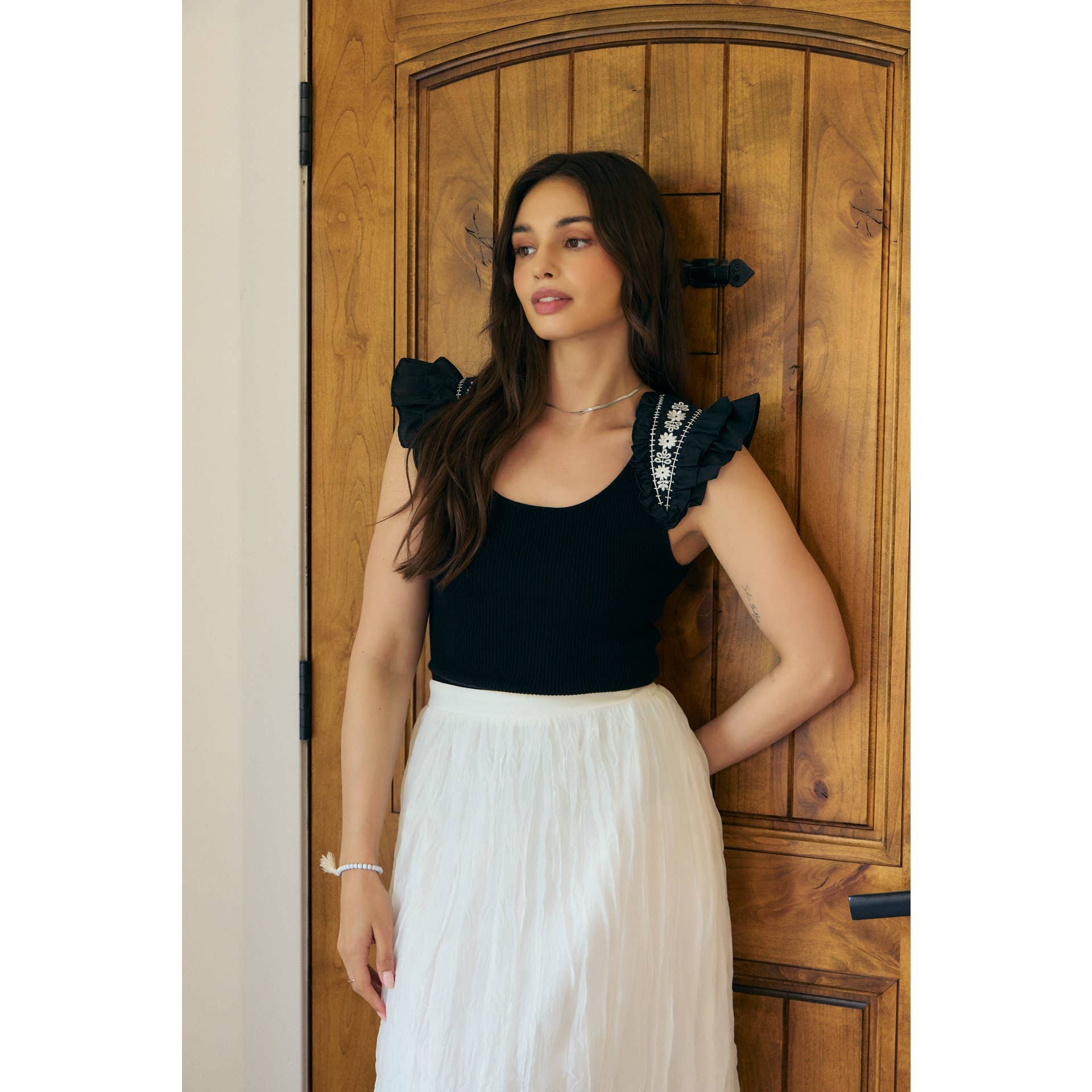 EMBROIDERY SOFT RIB SWEATER TOP WITH RUFFLED SLEEVES