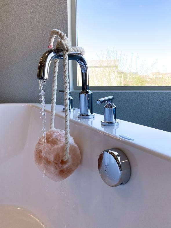 2lb Pure Pink Himalayan bath and shower hanging salt rock. Comes with 3ft. hanging rope and hand dip dyed bag. Rock shapes and colors vary by rock because the product is 100% natural.